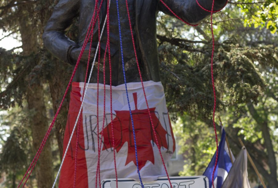 The John A. Macdonald Statue in Regina’s Victoria Park has been ceremonially “hanged” by the Indigenous people with ropes around its neck. Indigenous protesters and their supporters reject celebrating the injustices Macdonald inflicted upon Indigenous peoples through assimilation methods, such as Residential Schools and the Indian Act.