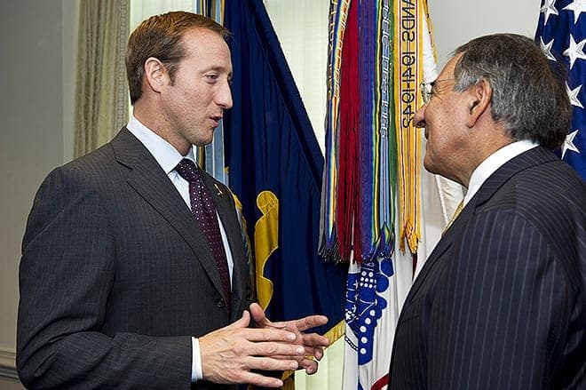 110930-D-BW835-006¬¬Canadian Minister of Defense Peter MacKay, left, speaks with Secretary of Defense Leon Panetta before sitting down to a meeting in the Pentagon in Arlington, Va., on Sept.30, 2011. Panetta and Mackay are meeting to discuss security matters of mutual interest. DoD photo by Erin A. Kirk-Cuomo. (Released)