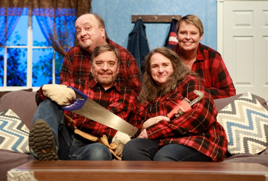 A cast photo from Regina Little Theatre’s production of A Red Plaid Shirt. From left to right and top to bottom: Kep Spencer, Brenda Cheater, John Chaput and Darlene Barss. Four actors are wearing red plaid shirts while sitting on a couch holding workshop tools. Garett Harnish