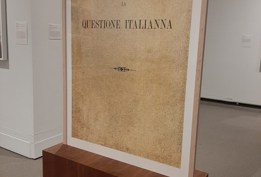 Another feature in the exhibit was prints from a magazine called Rivista Coloniale. The Rivista Coloniale ran from 1906 to 1943 and was published by the Italian authorities. The goal of the paper was to “inform Italians about political, economic, legal, and social aspects of the colonies.” This section, “Preoccupations,” was subtle, yet powerful. Even the number of prints in “Preoccupations” had significance. Petros used “[s]hips, figurines, and other motifs” to show how Italy changed and fell into “[f]ascist ideology.”